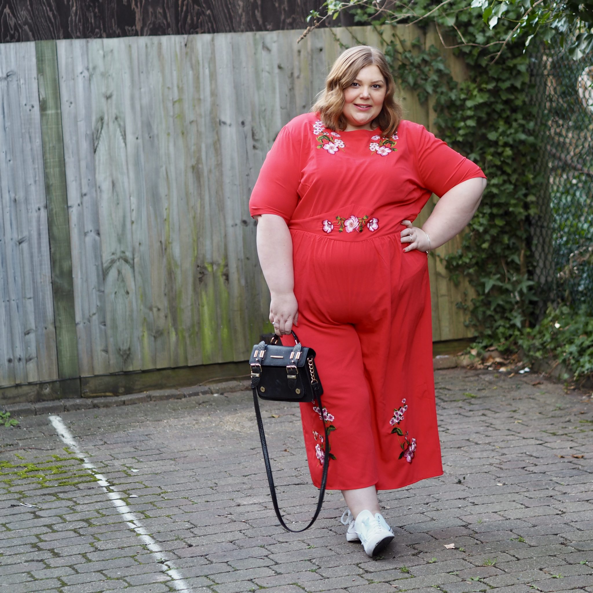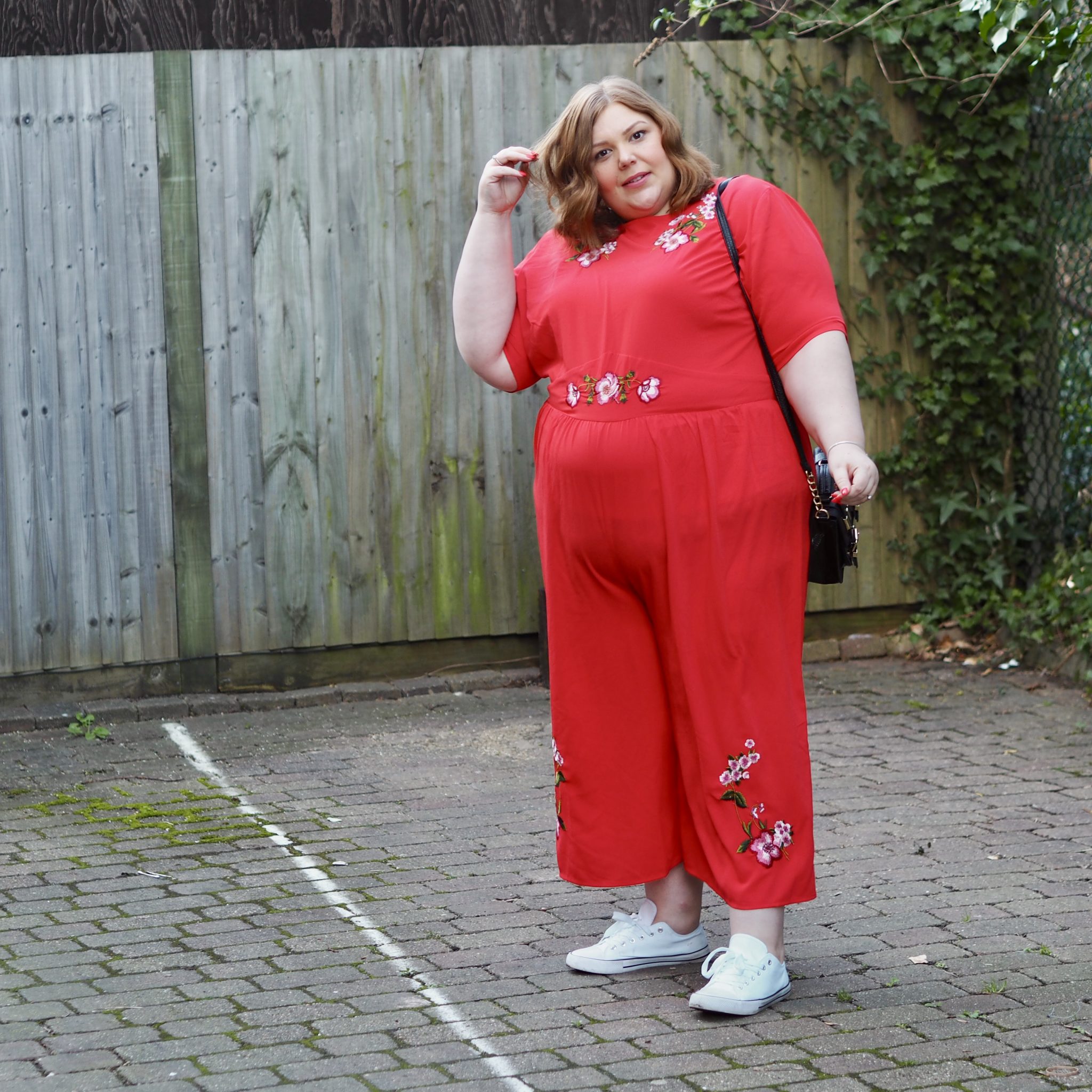 I know that’s easier said than done. I REALLY know it is. So here’s an example of something I went through recently when it came to wearing this beautiful red ASOS Curve jumpsuit. Looking at the jumpsuit, it’s beautiful. Really stunning. A gorgeous bright red, a lovely shape and it has that comfortable look to it. So I popped it on, knowing I feel in love with the last jumpsuit I tried. I expected that rush of OMG I LOVE IT! Instead I was a bit apprehensive. I stood on the mirror and all I could see were flaws. A bit of a camel toe if I stood in certain positions. A growing belly. Was I frumpy? Was the blog red too much? Was I going to stand out because of being fat? All of a sudden these questions come rushing through like a train until I feel like I want to go and put on some basic leggings and a tunic top. There’s nothing wrong with an outfit like that, but I know it doesn’t fill me with confidence. It just conforms to what we’ve been told (for so long) is acceptable for big women to wear.